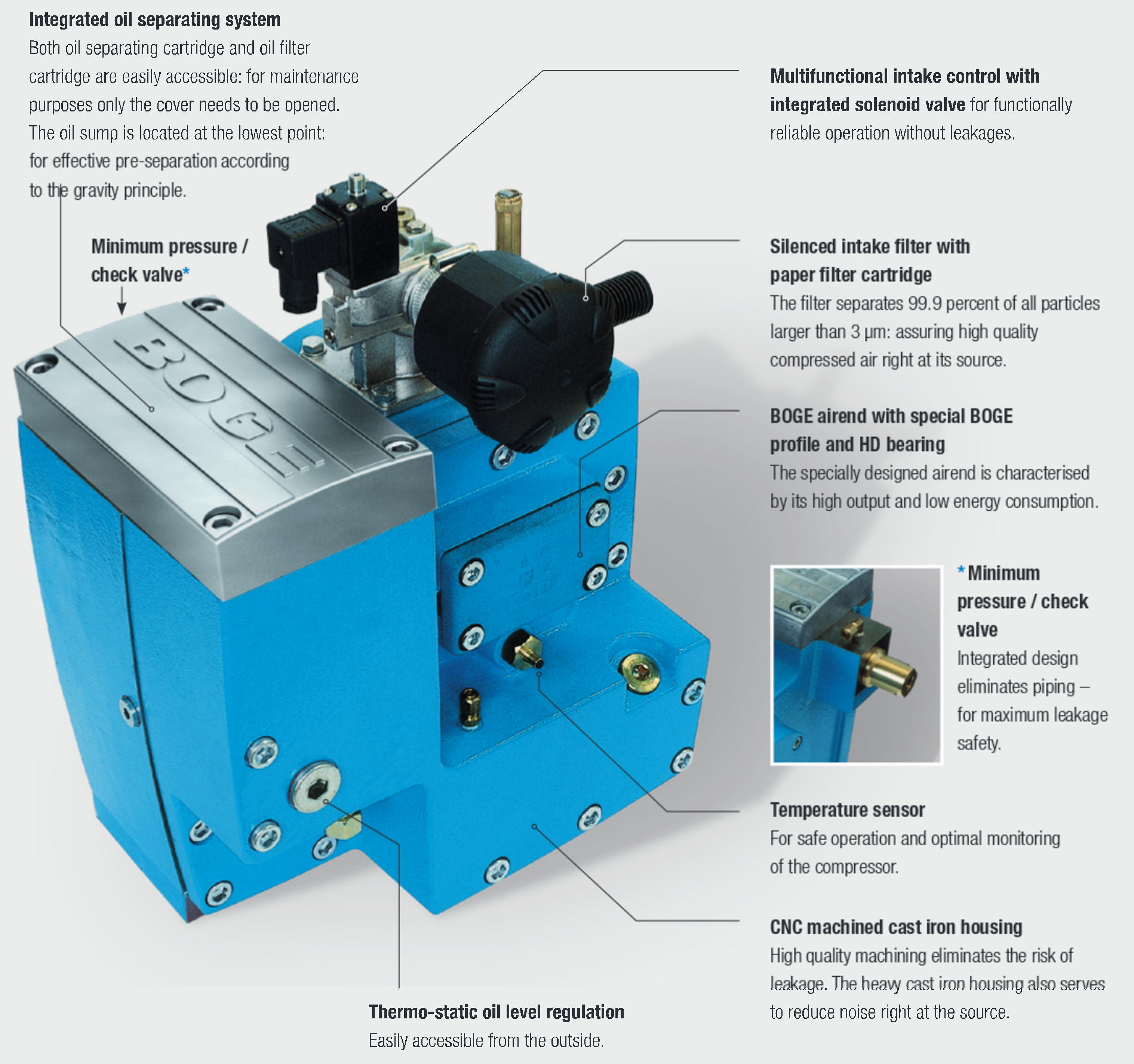 Compact & highly effi cient! The monoblock compact design of the airend range up to 7.5 kW offers distinct advantages. The integrated design minimises the number of oil pipes by clever internal routing - for a highly efficient and reliable compressor. At the same time the airend requires less space providing the user with a compact, space saving and energy efficient solution from BOGE!