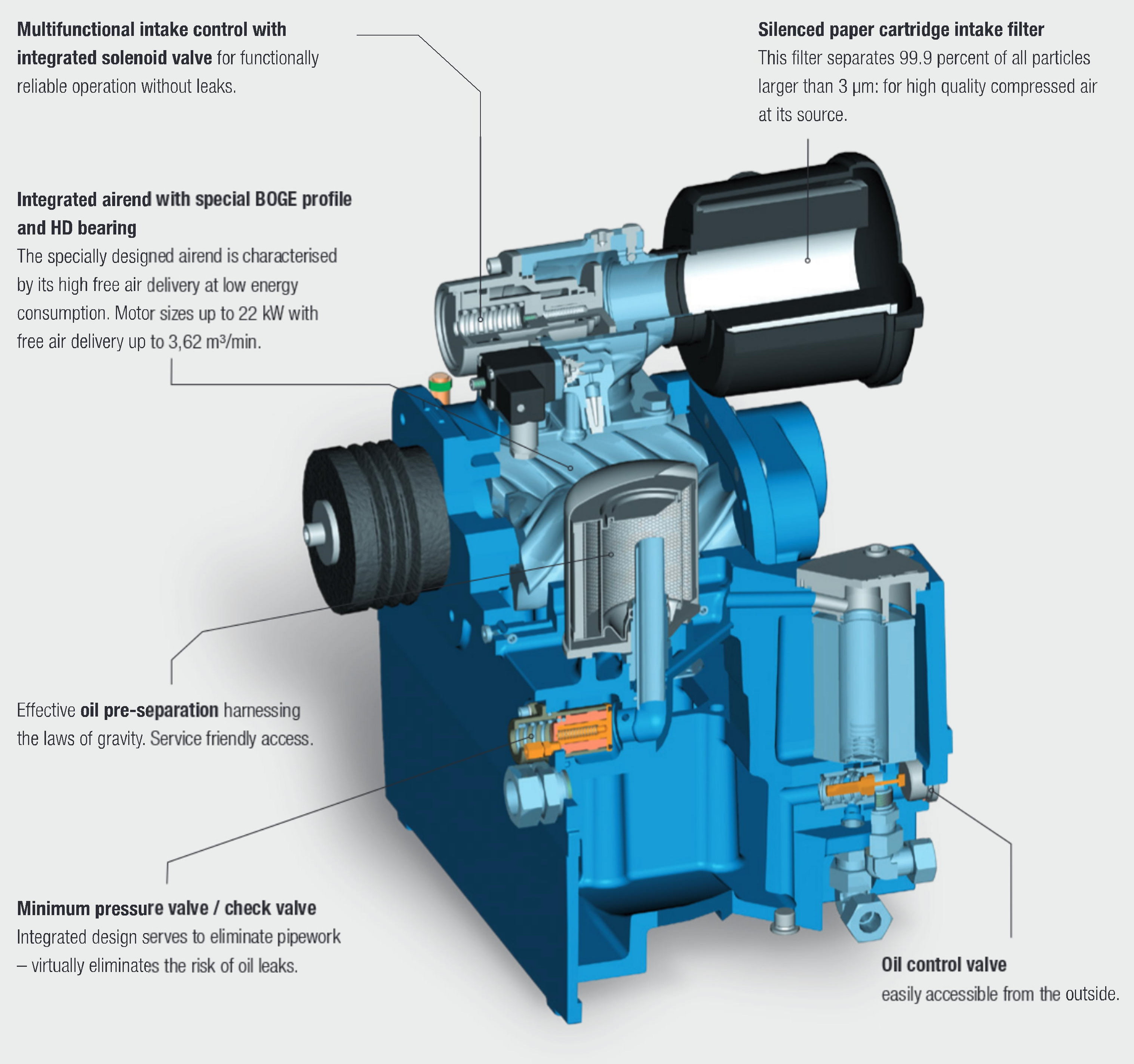Compact & highly effi cient! The monoblock compact design of the airend range up to 7.5 kW offers distinct advantages. The integrated design minimises the number of oil pipes by clever internal routing - for a highly efficient and reliable compressor. At the same time the airend requires less space providing the user with a compact, space saving and energy efficient solution from BOGE!
